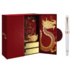 Hộp quà bút ký chủ đề Kinh thành Huế có thiết kế cánh bướm với gam màu đỏ thẫm tượng trưng cho may mắn, được trang trí bằng các chi tiết vàng tỉ mỉ. Họa tiết rồng và Kinh thành Huế tạo nên nghệ thuật mang đậm giá trị văn hóa, thể hiện rõ chủ đề “Hào Khí Cố Đô”.