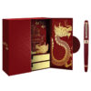 Hộp quà bút ký chủ đề Kinh thành Huế có thiết kế cánh bướm với gam màu đỏ thẫm tượng trưng cho may mắn, được trang trí bằng các chi tiết vàng tỉ mỉ. Họa tiết rồng và Kinh thành Huế tạo nên nghệ thuật mang đậm giá trị văn hóa, thể hiện rõ chủ đề “Hào Khí Cố Đô”.