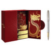 Hộp quà bút ký chủ đề Kinh thành Huế có thiết kế cánh bướm với gam màu đỏ thẫm tượng trưng cho may mắn, được trang trí bằng các chi tiết vàng tỉ mỉ. Họa tiết rồng và Kinh thành Huế tạo nên nghệ thuật mang đậm giá trị văn hóa, thể hiện rõ chủ đề “Hào Khí Cố Đô”.